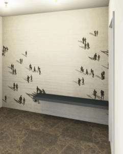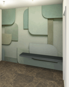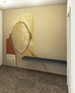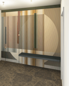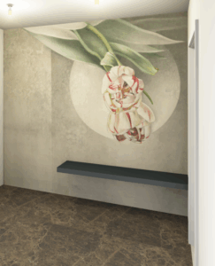 Für langjährige Kunden konnte ich den Eingang neugestalten. Es war eine Aufwertung des Hauseingangs gewünscht. Wir hatten uns aufgrund des geringen Aufwands schnell für eine Tapete als Wandverkleidung entschieden, auch weil im Haus schon das Bad und das Schlafzimmer mit Tapeten ausgestattet wurden. Die Wahl aus den Entwurfsvarianten fiel dann auf das sehr stimmungsvolle Motiv „La Galleria“ von Tecnografica in der Tapetenqualität Fabric.